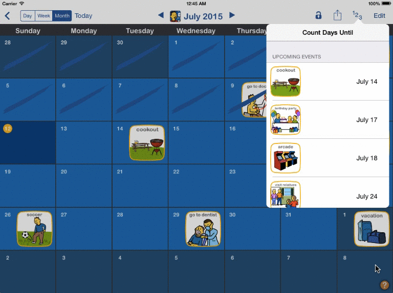 You can use the countdown feature to visually and auditorily count number of days until a future event. Kids enjoy using this feature when waiting for a highly anticipated event like a birthday, vacation or special occasion. Note: You can not countdown to events that are more than 60 days in the future.