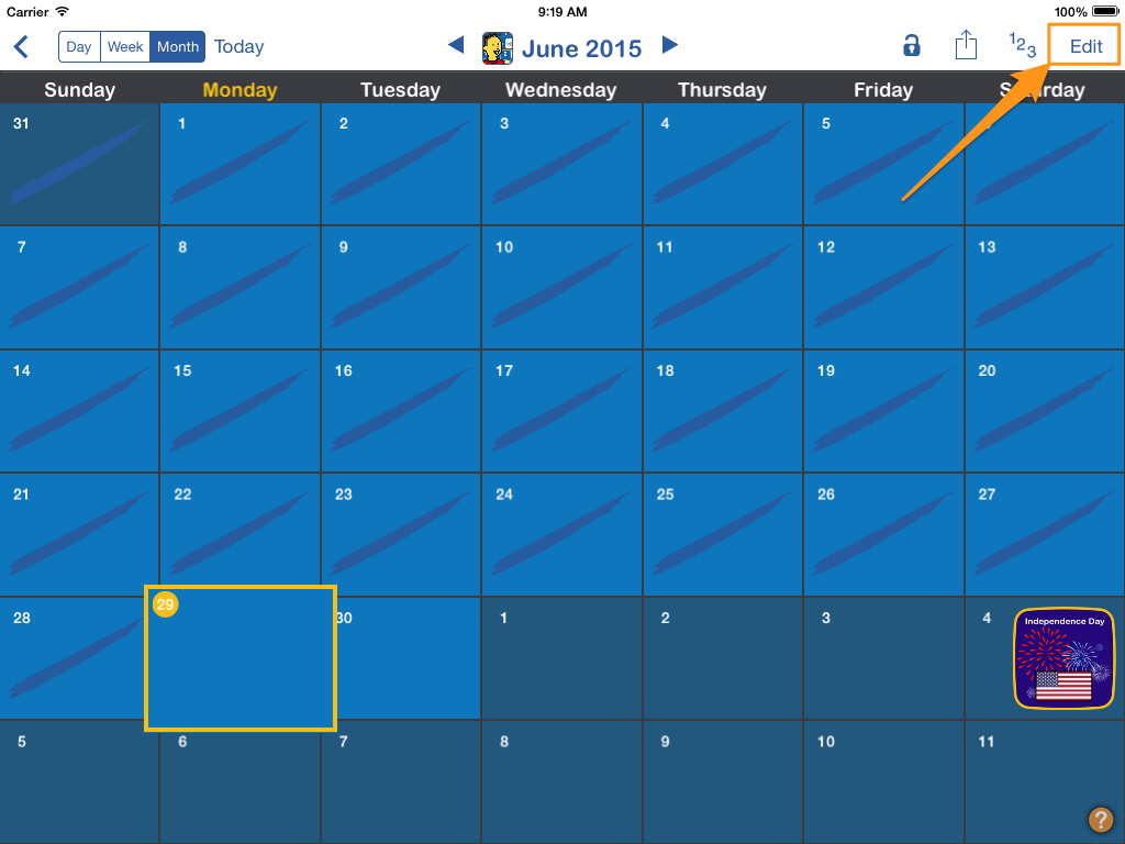 Open the calendar you wish to edit by selecting it from the apps main screen. Tap on 'Edit' in the top right to switch into editing mode.