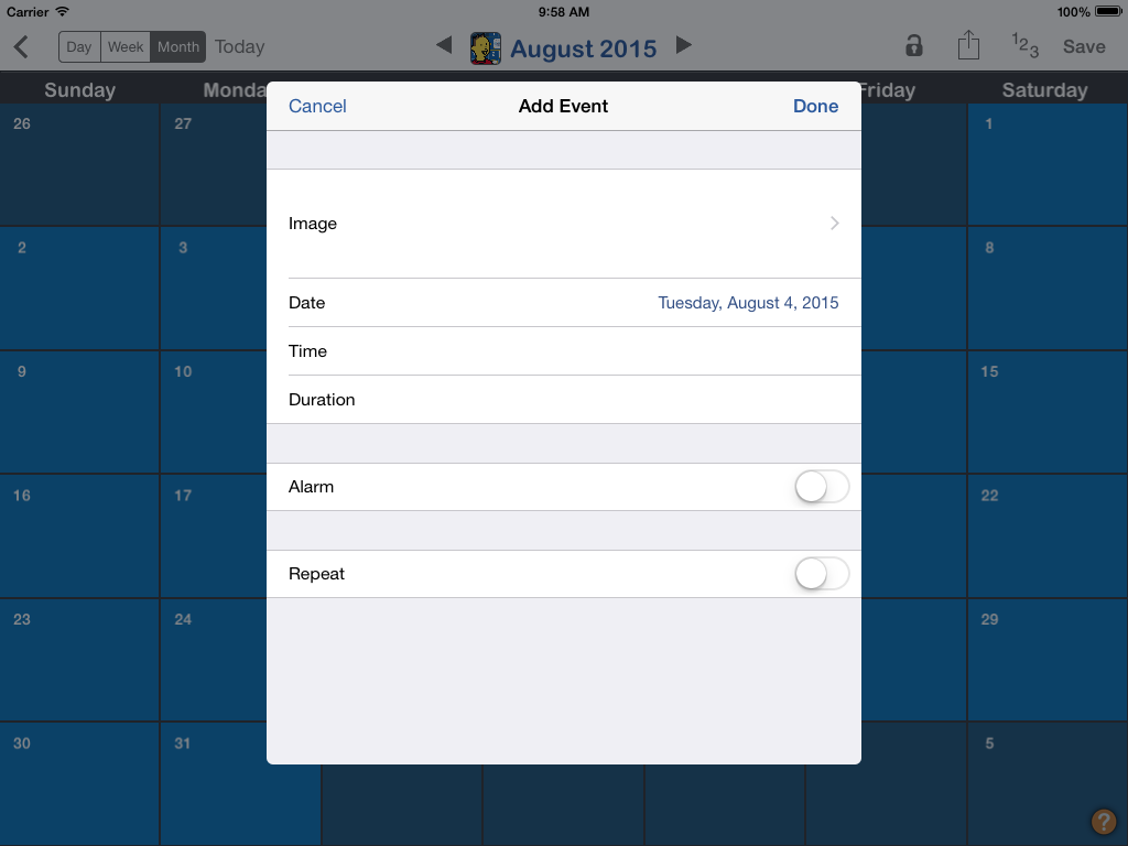 Select an image and adjust the date, time, duration and alarm fields as desired. Turn the "Repeat" switch to on to make this a repeating event. Tap "Repeat On" to select the day(s) of week that this event occurs. Tap "Ends On" to set the date when the last event occurs. Tap "Done" when finished.